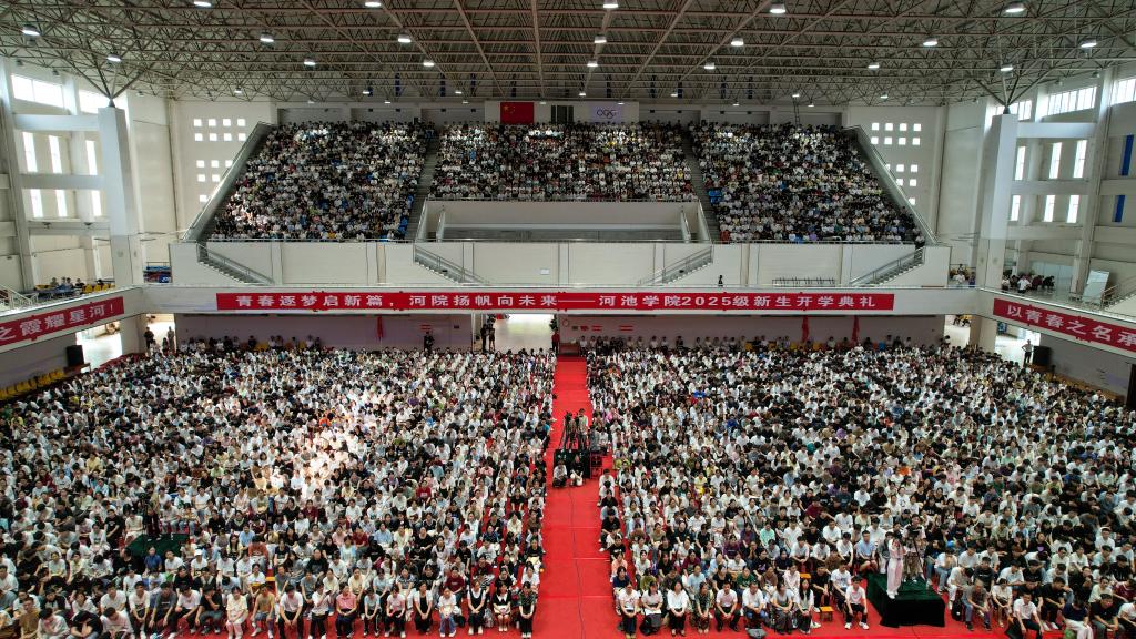 龙江向东秋月欢,会仙迎客八方来。9月16日,我校在体育馆举行2025级新生开学典礼,近4700名新生正式以“河院人”的身份,开启了新的征程。学校党委书记甘毅出席典礼,校长马少健出席典礼并讲话。我校优秀校友、第十一届茅盾文学奖获得者东西,优秀校友、深圳市雨滴科技有限公司总经理吴玉勇现场为学生寄语。优秀校友、广西文联副主席、第十三届全国少数民族文学创作骏马奖获得者凡一平通过视频为新生作寄语。全体校领导、党委常委,各二级学院、各部门主要领导出席典礼。