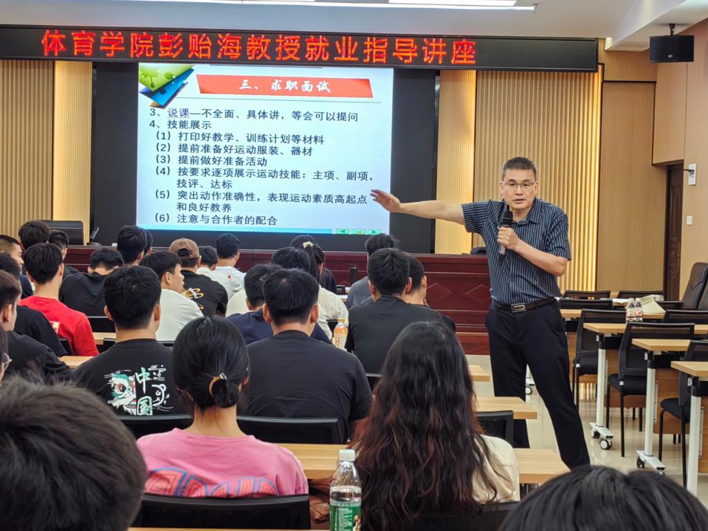 5月24日,体育学院在格致楼102会议室举办就业指导专题讲座。讲座由银铃教师彭贻海教授主讲,体育学院副书记韦宝主持,辅导员、毕业班班主任及毕业班学生代表聆听讲座。