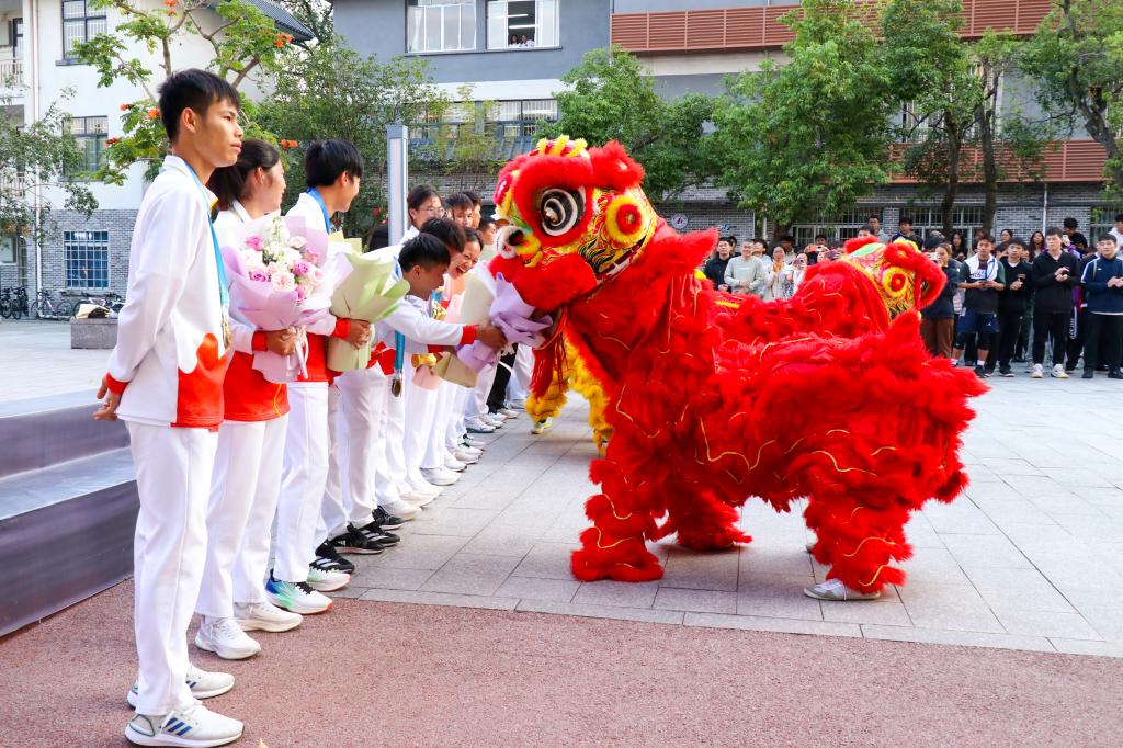 仪式现场,锣鼓喧天,掌声四起,四只威风凛凛的狮子在场地中跳跃、舞动,一派热闹喜庆景象。韦安光、马少健等校领导与独竹漂、板鞋运动队队员逐一亲切握手,学生代表为他们献上鲜花,向他们表示祝贺,鼓励他们继续秉承“平等、团结、拼搏、奋进”的宗旨,弘扬中华体育精神,传播民族体育正能量,砥砺前进,追求卓越,再立新功,为学校完善德智体美劳全面发展的育人体系,发挥体育在立德树人中的重要作用,作出新的更大贡献。