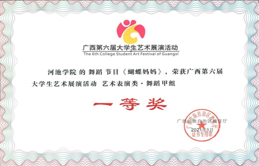 2021年1月,河池学院舞蹈节目《蝴蝶妈妈》荣获广西第六届大学生艺术展演一等奖