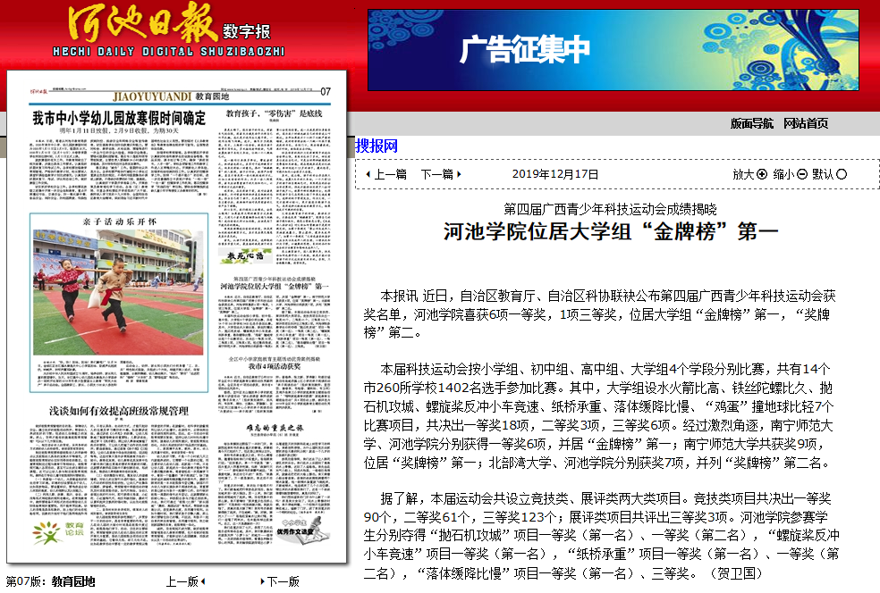 12-172019【河池日报】第四届广西青少年科技运动会成绩揭晓 河池学院位居大学组“金牌榜”第一河池日报:http://hcrb.hcwang.cn/html/2019-12/17/content_203538.htm本报讯 近日,自治区教育厅、自治区科协联袂公布第四届广西青少年科技运动会获奖名单,河池学院喜获6项一等奖,1项三等奖,位居大学组“金牌榜”第一,“奖牌榜”第二。本届科技运动会按小学组、初中组、高中组、大学组4个学段分别比赛,共有14个市260所学校1402名选手参加比赛。其中,大学组设水火箭比高、铁丝陀螺比久、抛石机攻城、螺旋桨反冲小车竞速、... -
