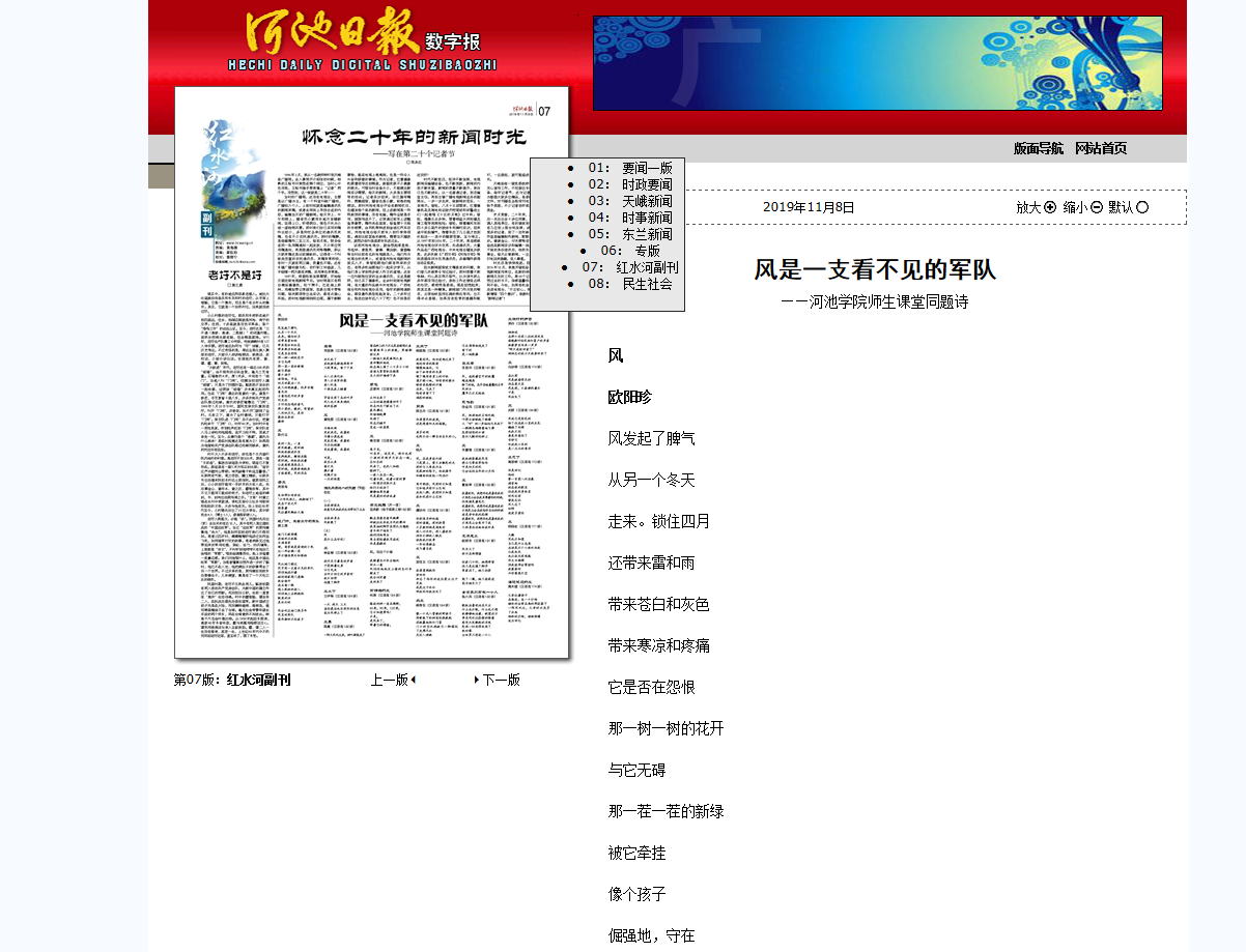 11-082019【河池日报】风是一支看不见的军队 ——河池学院师生课堂同题诗河池日报:http://hcrb.hcwang.cn/html/2019-11/08/content_201989.ht -